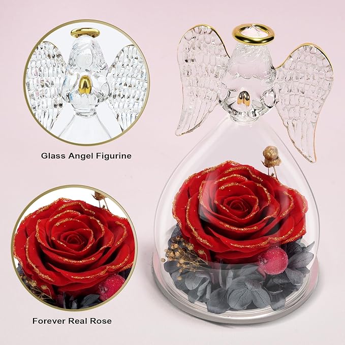 - Our angel figure forever real rose is made with unique preservation process, which can last 3-5 year, you just need to put the angel preserved flowers rose gift in a cool place, no need watering and sunlight.