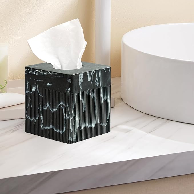 Tissue Box Cover Square Resin Tissue Holder for Home Decor, Hand Poured Marble Tissue Box Holder, 5 x 5 x 5.5 inches, Black