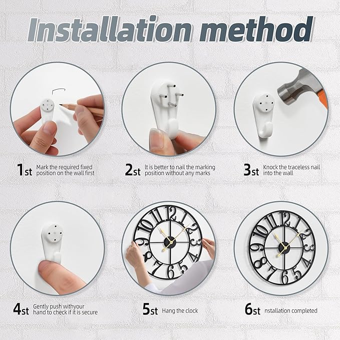 - [Easy to Read and Hang] - The large jumbo numbers in contrast with aluminum large hands for easily reading. Simple design with a good performance. Package Comes with 1 set extra color interchangeable Clock Hands, also included Invisible Nail Hangers for simple hanging. And it powered by 1 AA battery ( NOT INCLUDE ON PACKAGE).