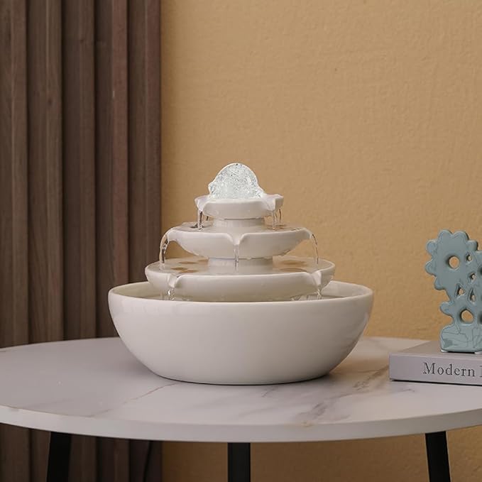 Indoor Tabletop Ceramic Fountain Water Feature Home Kitchen Office Decoration Modern Design Style (White)