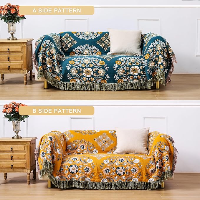 Boho Throw Blanket, 100% Cotton Soft Sofa Bed Queen Throw-Floral Farmhouse Decor Blanket, Reversible Bohemian Yellow Throw for Chair Couch Quilt and Gift, 80" x 90"