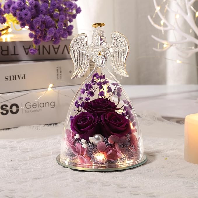 - Mothers Day Gifts for Mom,Birthday gifts for Women- Angel statue made of clear glass with golden outline drawing wings, halo and folded palms. Preserved flower is made of natural Japanese rose with unique preservation process, most keep the same color, shape and feeling of fresh cut flower, which can last 3-5 year, you just need to put the angel gifts in a cool place. Do not place in direct sunlight and humid places.