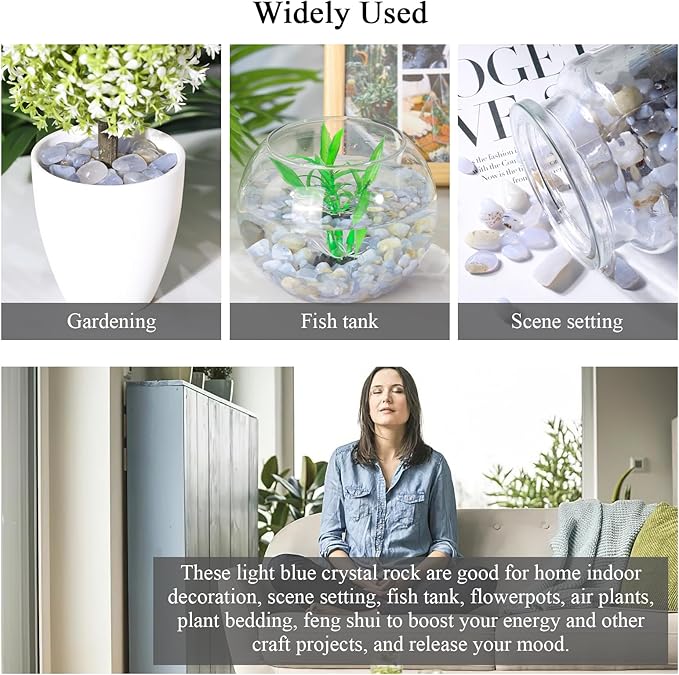 - 【Useful Decorative Helper】 These light blue crystal rocks are ideal for home decoration, scene setting, fish tank decoration, flowerpots, air plants, plant bedding, and other DIY craft projects. They add a natural and elegant touch to any space.