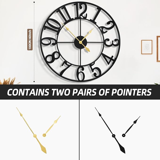 40 Inch Large Wall Clocks, Retro Black Metal Arabic Numerals Battery Operated Nearly Silent Oversize Decorative Clocks Wall for Living Room, Farmhouse, Entrance,Shop,Office Decor