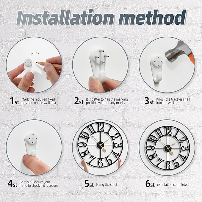 - [Easy to Read and Hang] - The large jumbo numbers in contrast with aluminum large hands for easily reading. Simple design with a good performance. Package Comes with 1 set extra color interchangeable Clock Hands, also included Invisible Nail Hangers for simple hanging. And it powered by 1 AA battery ( NOT INCLUDE ON PACKAGE).