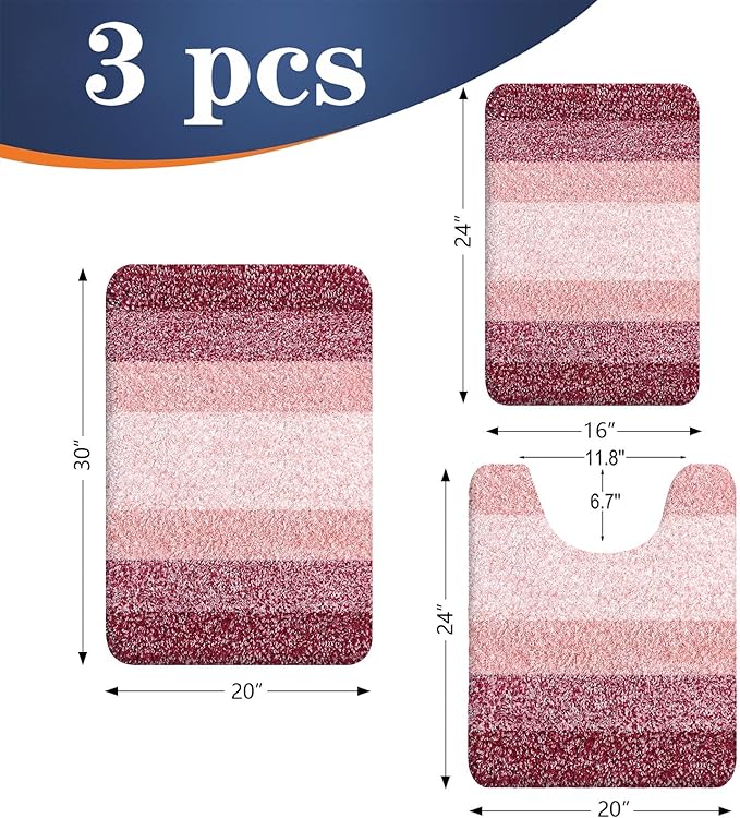 OLANLY Bathroom Rugs Sets 3 Piece, Soft Absorbent Microfiber Bath Mats and U-Shaped Contour Toilet Rug, Plush Shaggy Bath Mat Set for Bathroom (30"x20"+24"x16"+24"x20", Red)
