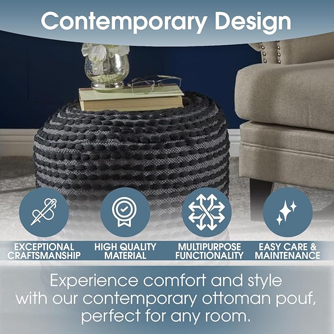 - VERSATILE AND STYLISH: Beyond its cozy seating option, this pouf serves multiple purposes - from a footrest to a side table, enhancing both the aesthetics and utility of your home. Its stylish design ensures it fits in effortlessly, whether indoors or outdoors, making it a versatile addition to any modern decor.
