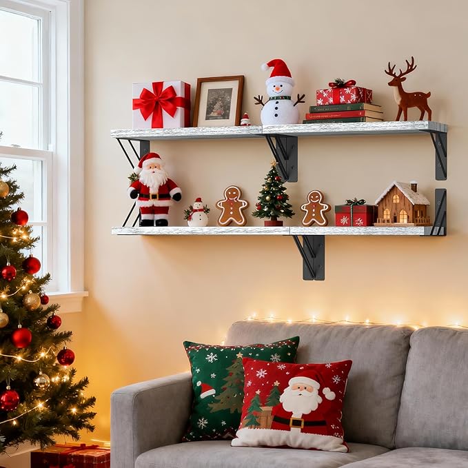 - Create a stylish display with our rustic wall-mounted shelves. Perfect to display decor, these offer ample space for books, decor, and more. The Gray White finish makes them a versatile addition to any room, enhancing your overall decor