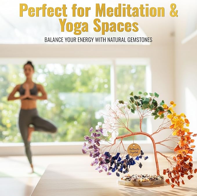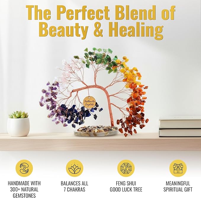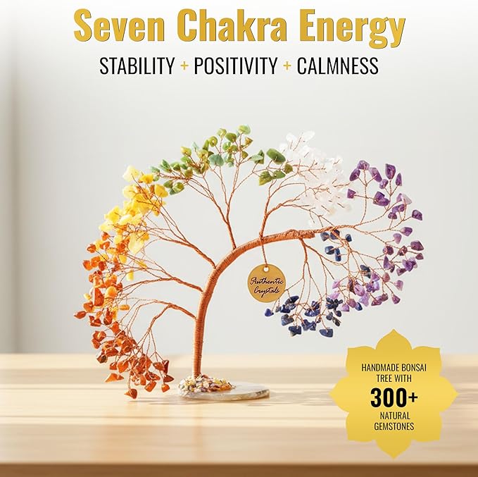 - HANDMADE 7 CHAKRA CRYSTAL TREE FOR HOME & OFFICE DÉCOR: Crafted with love, this tree of life features over 300 natural gemstone beads and stands 5–5.5 inches tall. A stunning 7 chakra tree centerpiece for your home, workspace, meditation altar, or yoga studio—promoting peace, balance, and harmony in every space.