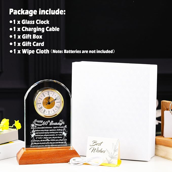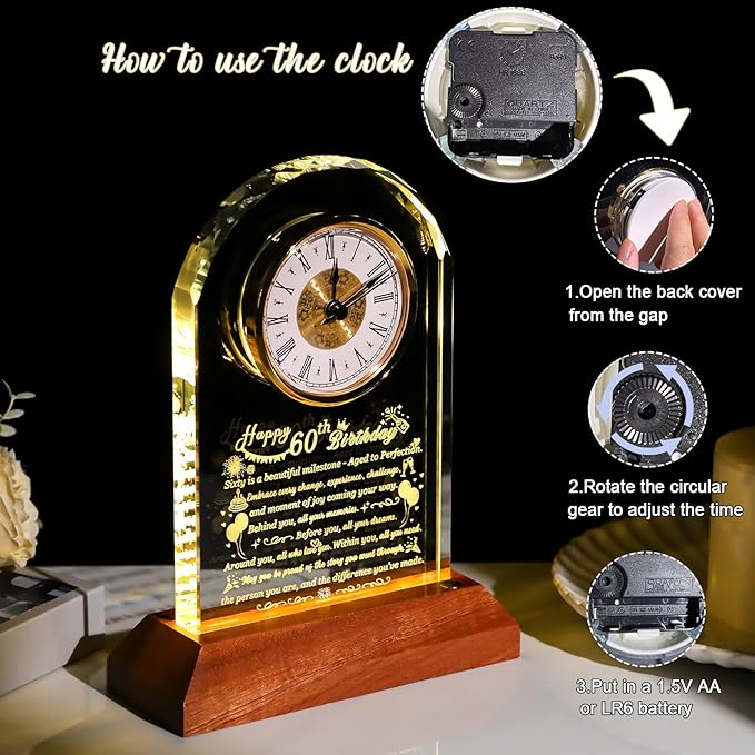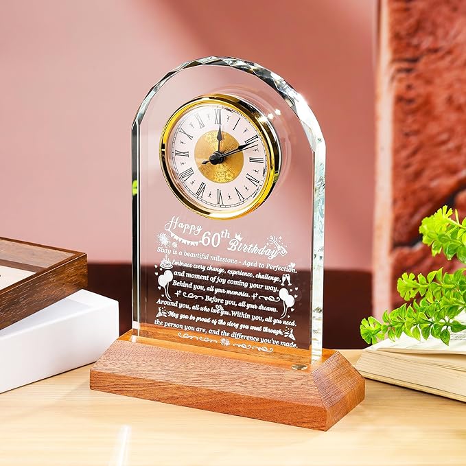 - Exquisite Craftwork - The 60th birthday clock is made of clear and smooth glass without impurities, matched with a quartz clock, glittering and eye-catching. The warm sayings are etched in the middle of it. The top of its arch edge is polished into multiple facets to better reflect lights and increase the sense of splendor. Good size for display: 9.0x5.1in/23x13cm