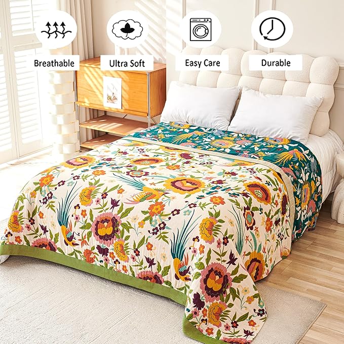 Boho Throw Blanket, 100% Organic Cotton Breathable Ultra Soft 91" x 98" Bed Quilt Throw - All Season Floral Rustic Farmhouse Decor Luxury Reversible Blanket for Sofa Couch Chair and Gift