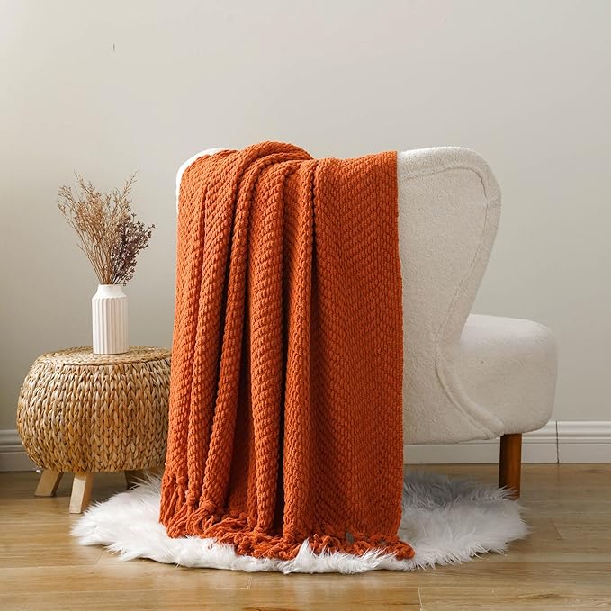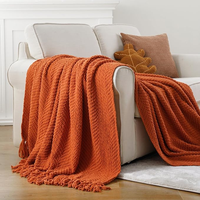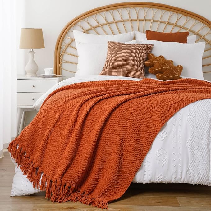 BATTILO HOME Burnt Orange Throw Blanket for Couch, Knit Fall Decor Blanket Versatile for Chair, Decorative Halloween Blanket with Tassels for Bed, 60" x 80"
