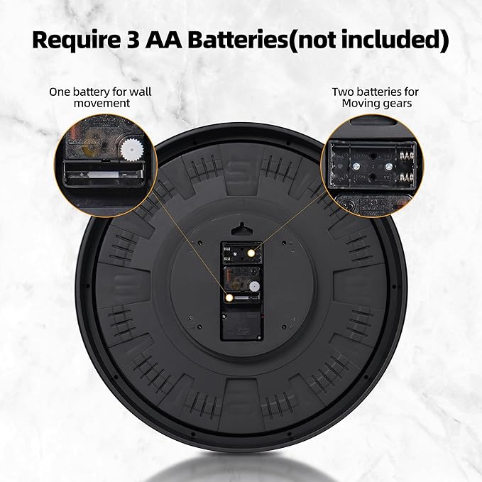 - 【EASY TO HANG】 Requires three AA battery, one for the clock , and two for the moving gear. And this wall clock is simple to hang based on included round keyhole style installation on the center back.