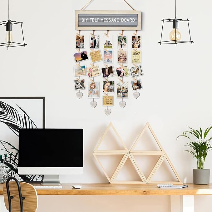 - 【DIY COLLAGE PICTURE FRAME】: Such hanging photo display comes with a felt letter board, pre-cut 340 letters/numbers in cotton drawstring bag, 30 clips, and 5 adjustable hemp ropes with hearts pendant can satisfy almost any occasions.Just build your favorate quotes and put photos on ,simply make arbitrary changes whenever.