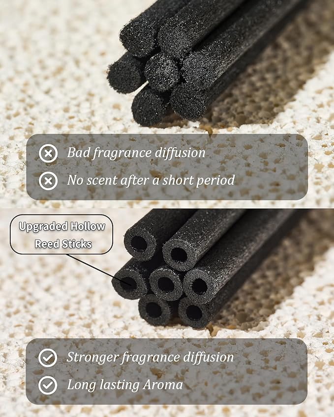 - Upgraded Hollow Reed Sticks - Compared to ordinary solid sticks, hollow scent diffuser sticks boast stronger fragrance diffusion capability and a broader fragrance diffusion scope. Additionally, dust won't clog them, so there is no issue of losing scent after a period of use.