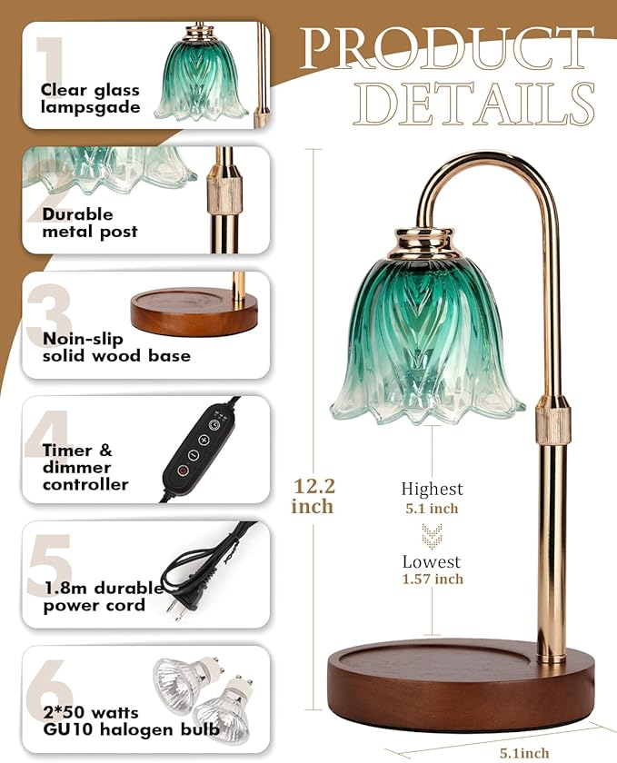 - Safety with Timer: This candle warmer lamp with timer uses 2 included 50W bulbs to melt wax without smoke, or soot—keeping your air clean and your home safe. Set the convenient 2/4/8-hour timer for worry-free operation, eliminating the danger of forgotten candles. A truly carefree way to enjoy your favorite fragrances