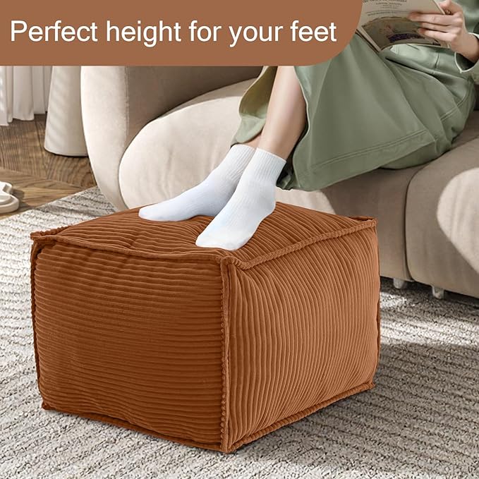 MeMoreCool Square Stuffed Pouf Ottoman Foot Rest, Corduroy Floor Pouf Foot Stool with Foam Chunk Filling, Soft Stuffed Ottoman Footrest for Living Room, Coffee