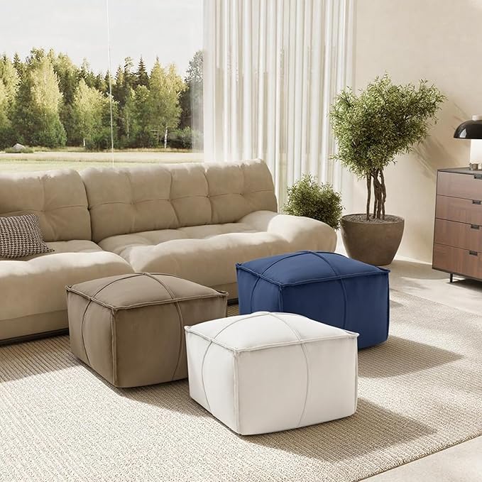 - Modern Square Pouf Ottoman: This soft foot stool pouf blends modern design with plush comfort. This stuffed ottoman foot rest is a chic choice for the couch, sofa, and living room